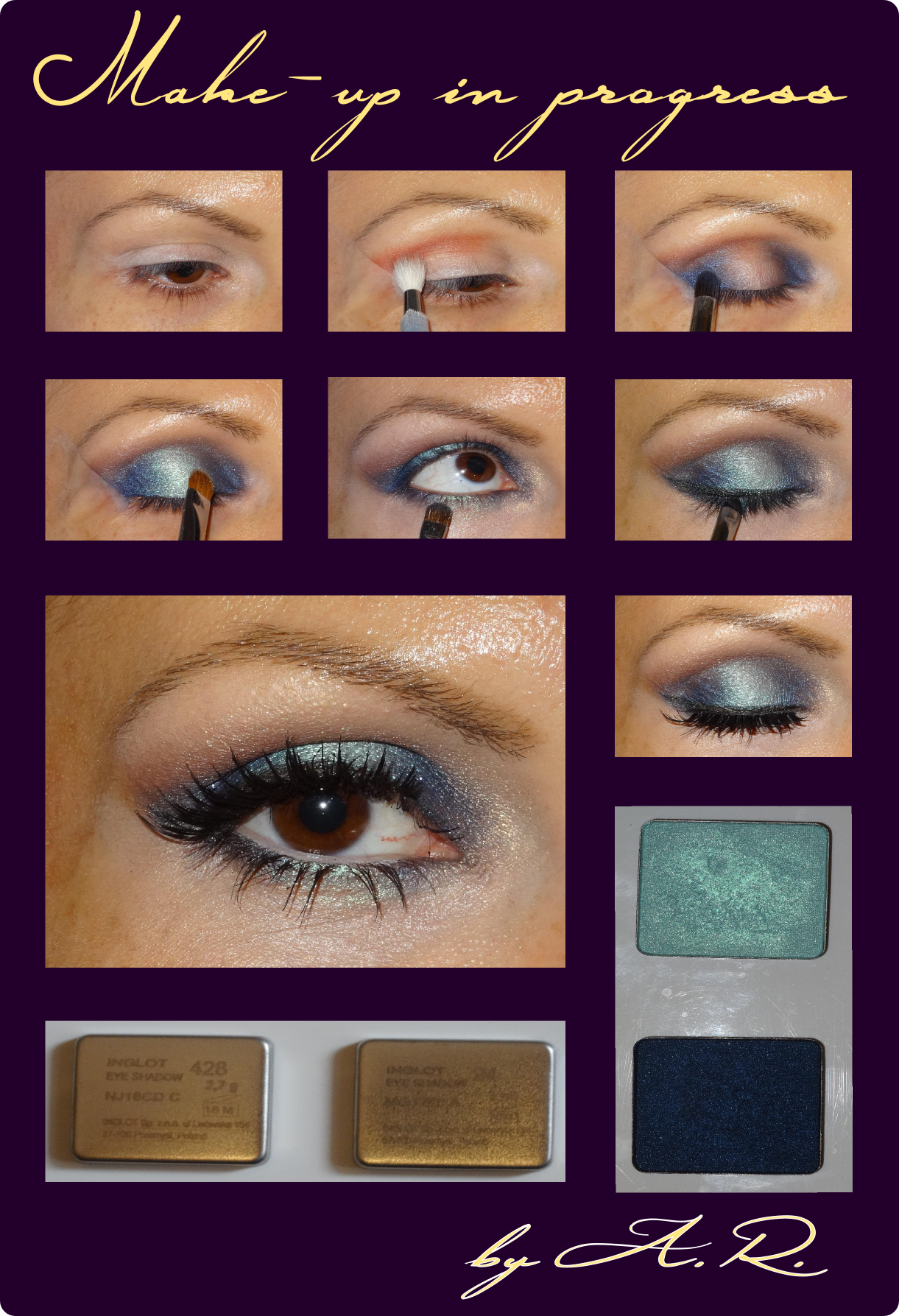 3. Trecem apoi la aplicarea culorii mai inchise in coltul exterior si coltul interior al ochiului, lasand in centru ochiului zona libera pentru a aplica culoarea mai deschisa care va crea iluzia de lumina. Trebuie sa amestecam bine culorile pentru a nu se observa linii aspre intre culori. Eu am ales pentru realizarea acestui machiaj bineinteles INGLOT, preferatele mele (stiu ca suna a reclama, dar chiar imi plac). Am folosit culorile 428 pentru culoarea inchisa si 24 pentru lumina din centrul ochiului. Am uitat sa va spun ca puteti folosi in coltul exterior al ochiului, pentru ghidaj, banda scotch ;).