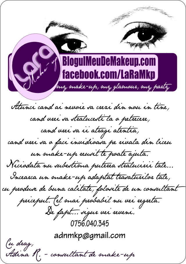 Cum am mai spus, cred ca o imagine valoreaza cat 1000 de cuvinte. Am machiat in acest week-end doua tinere si frumoase mamici, pentru petreceri de familie.. Sper ca am reusit sa le infrumusetez ziua/seara ;). Si nu uitati, folositi numai produse originale… (o sa va povestesc si de ce…). Ea este Ana… Iar ea […]